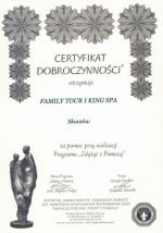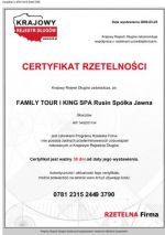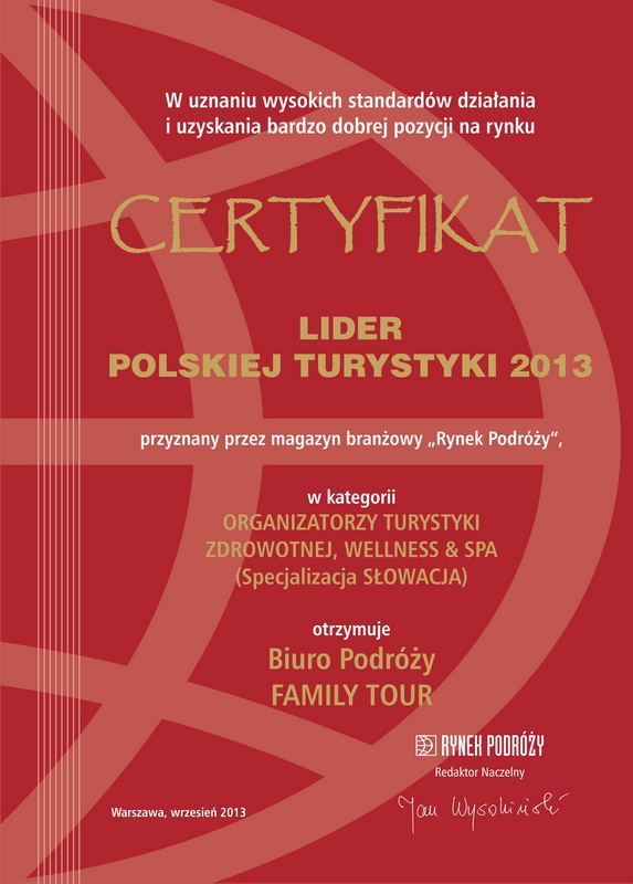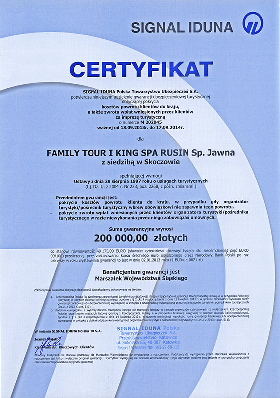 Biuro Turystyczne "Family Tour i King Spa ®" działa jako samodzielny, uprawniony organizator imprez turystycznych i posiada zezwolenie nr 758 wydane przez Wojewodę śląskiego, które potwierdza zabezpieczenie! Zabezpieczenie to zostało dokonane w formie polisy ubezpieczeniowej wystawionej przez SIGNAL IDUNA Polisy KL i NNW uczestników wyjazdów są zagwarantowane "UMOWĄ GENERALNĄ" z SIGNAL IDUNA S.A. Biuro występuje w urzędzie skarbowym pod nr NIP: 548-255-11-54. posiada odpowiednie dokumenty uprawniające do organizowania imprez turystycznych zgodnie z wymogami Ustawy o Usługach Turystycznych z dnia 29.08.1997 r. Stosownie do postanowień art. 14 ust. 4, pkt 1 i 2 ustawy (Dz. U. z 2001 r. Nr 55, poz. 578) z późniejszymi zmianami.